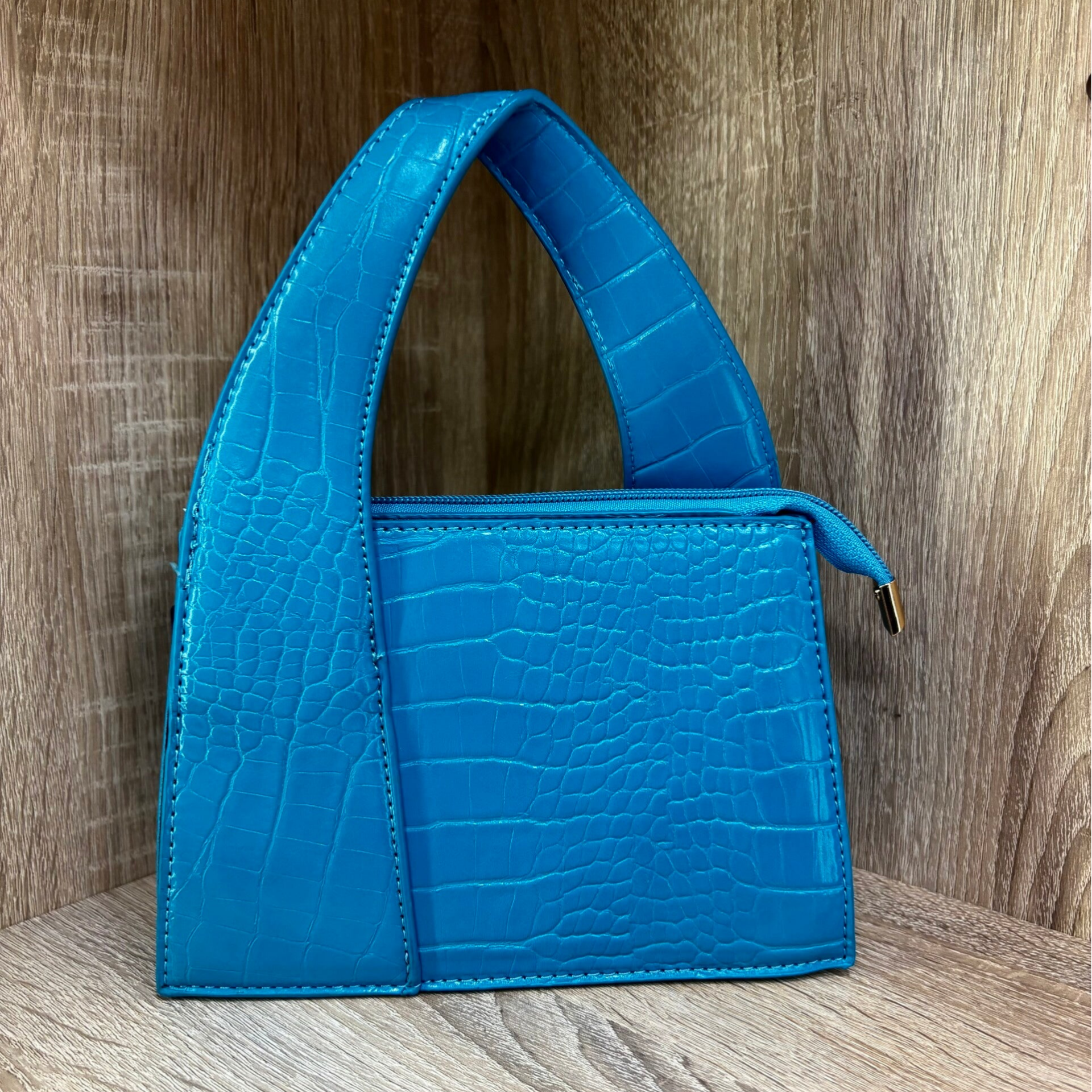 Questa borsa ha un design moderno e deciso, con una forma geometrica e linee pulite. È realizzata in ecopelle con effetto coccodrillo, che aggiunge una nota di lusso e originalità.