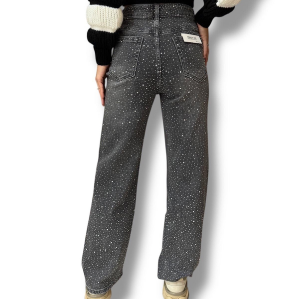Jeans a palazzo lavaggio grigio scuro ricoperto di strass avanti e dietro!